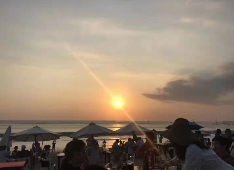 最后一站仍是海邊,而且,是擁有全球十大最美落日之一的金巴蘭海灘。傍晚的金巴蘭,夕陽(yáng)斜斜地掛在海天一線的地方,云層和海水被染得金黃,一層層地變換著顏色,滿目金黃,即使是不太感性的我也為之驚嘆不已。右前方的海灘上,一條機(jī)場(chǎng)跑道筆直延伸入海,銀色的飛機(jī)不斷起降,在斜陽(yáng)的照耀下劃出一道道美麗的弧線。沙灘上,一桌桌的盛宴已經(jīng)一字排開(kāi),就等著我們入席了。當(dāng)晚恰逢我們家駒哥哥的生日,同事們紛紛為他送上祝福。燭光搖曳,海風(fēng)輕柔地?fù)崤骖a,靜靜地,看夕陽(yáng)一點(diǎn)點(diǎn)地落入海中,此時(shí)此刻,吃什么已不再重要。難忘的,最是那一抹夕陽(yáng)醉了的溫柔。